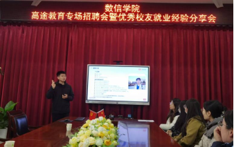 为推动校企合作走深走实,实现企业与校园优势互补、全项赋能学子成长,助力数学专业学子锚定职业方向、实现高质量就业,3月18日,mansion88明升成功举办“高途教育专场招聘会暨优秀校友就业经验分享会”。会议特邀高途EM全国校招负责人张庆波、应数专业2025届优秀毕业生罗昱霏作为企业与校友代表到校宣讲,mansion88明升党总支副书记杨向宇主持会议,辅导员陈婷、朱孟孟以及大三、大四员工代表到场参加。